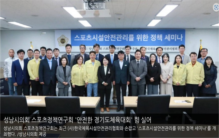 성남시의회 스포츠정책연구회 '안전한 경기도체육대회' 힘 실어 한국체육시설안전관리협회 0 1994 2023.05.04 09:31 http://m.kyeongin.com/view.php?key=20230501010000053 + 620